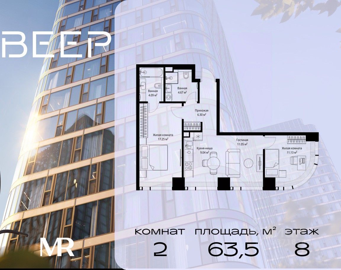 Продаётся 2-комнатная квартира общей площадью 63.53 м² без отделки в ЖК Веер на 8-м этаже 70 этажного дома.