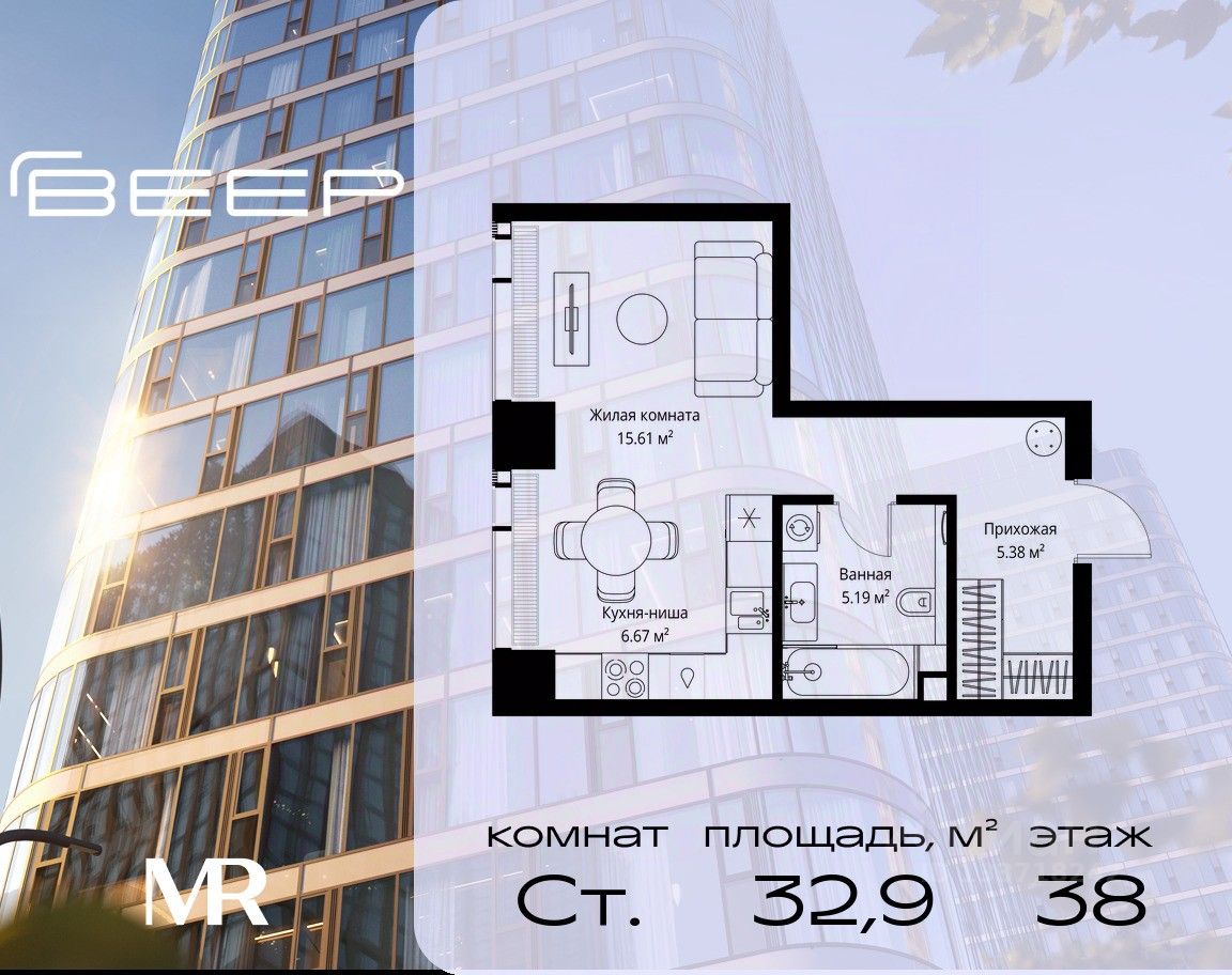 Продаётся студия общей площадью 32.85 м² без отделки в ЖК Веер на 38-м этаже 70 этажного дома.