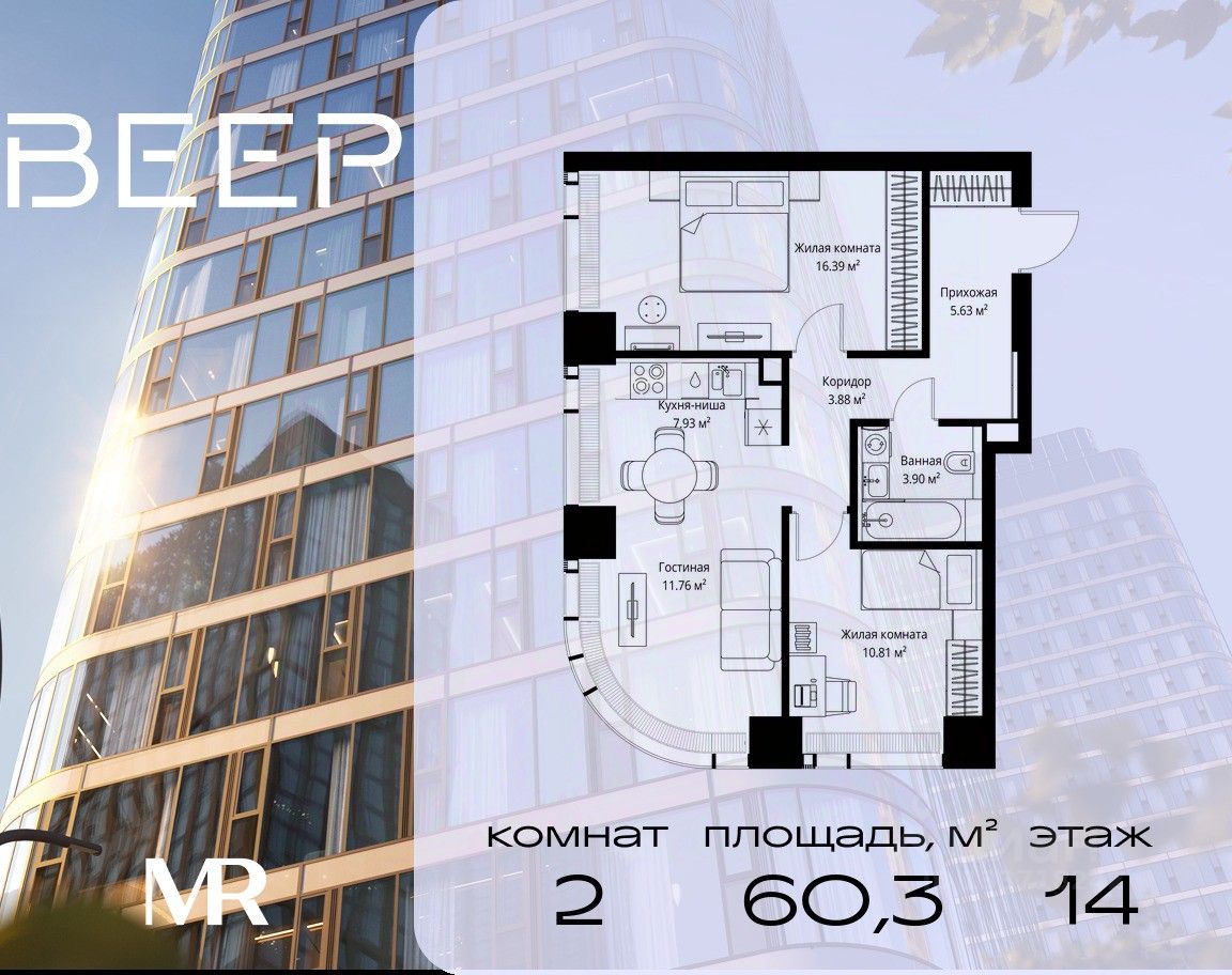 Продаётся 2-комнатная квартира общей площадью 60.30 м² без отделки в ЖК Веер на 14-м этаже 70 этажного дома.