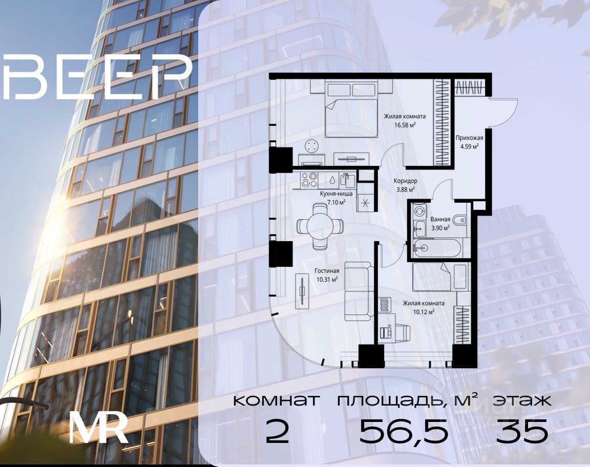 Продаётся 2-комнатная квартира общей площадью 56.48 м² без отделки в ЖК Веер на 35-м этаже 70 этажного дома.