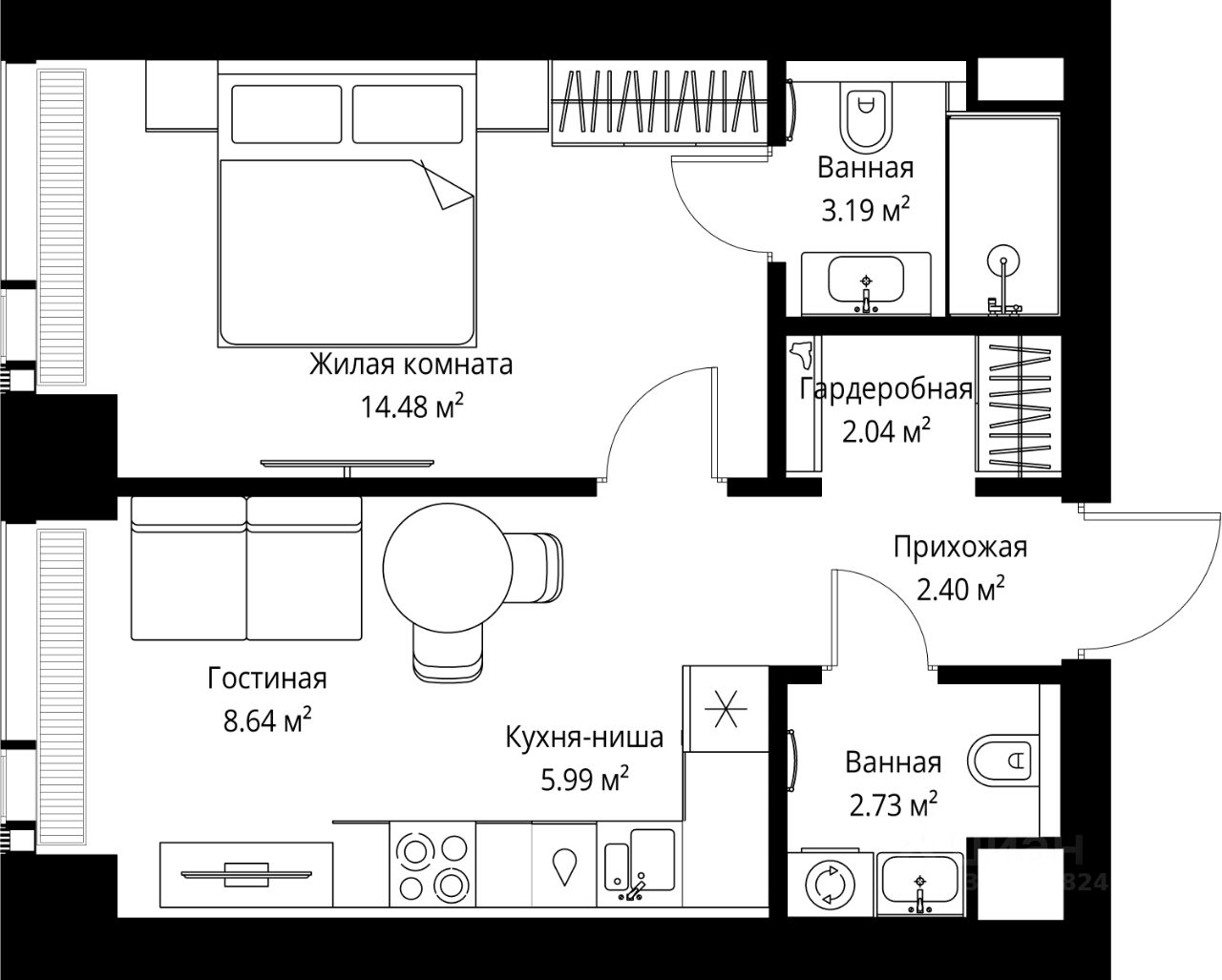 Продаётся 1-комнатная квартира общей площадью 39.47 м² без отделки в ЖК Веер на 41-м этаже 70 этажного дома.