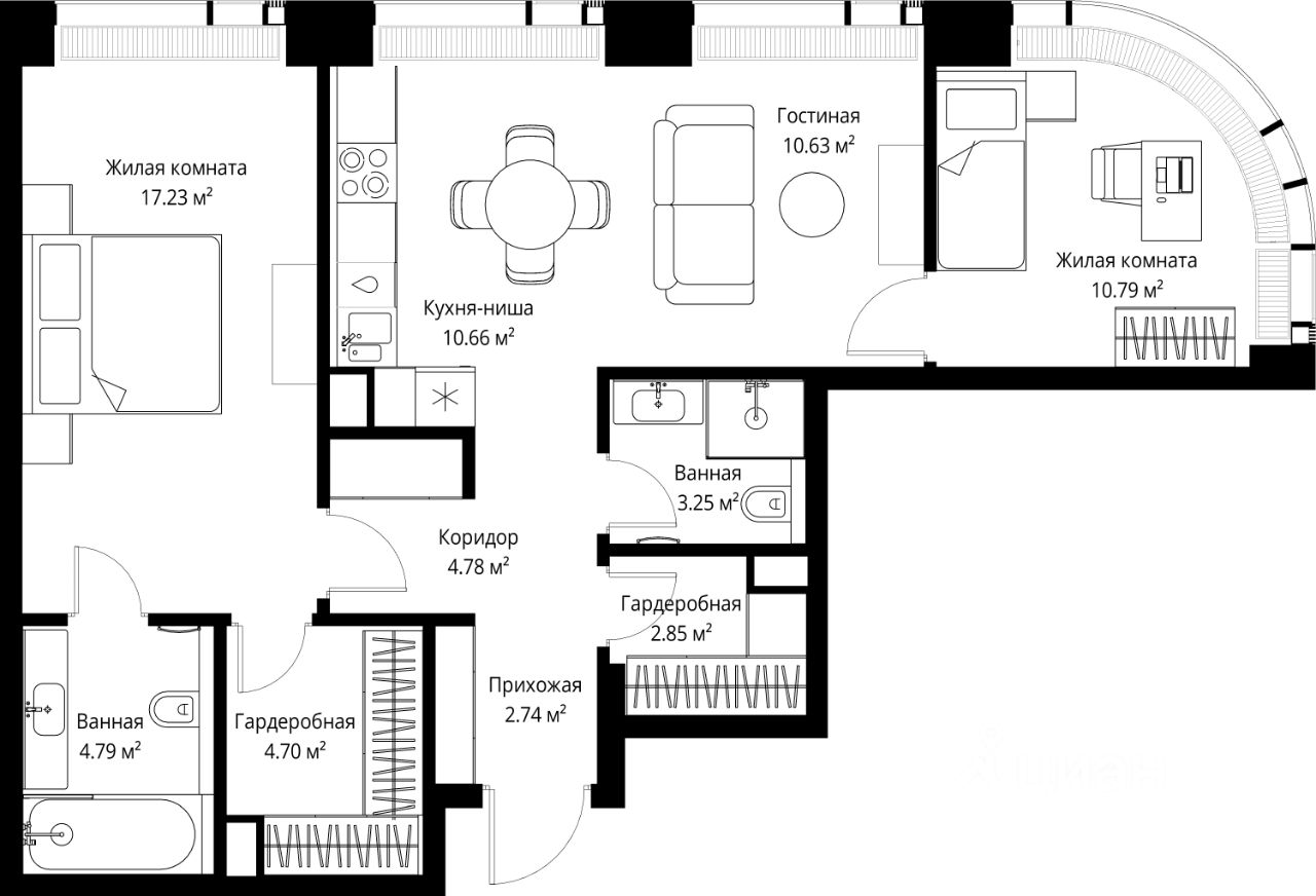 Продаётся 2-комнатная квартира общей площадью 72.42 м² без отделки в ЖК Веер на 60-м этаже 70 этажного дома.