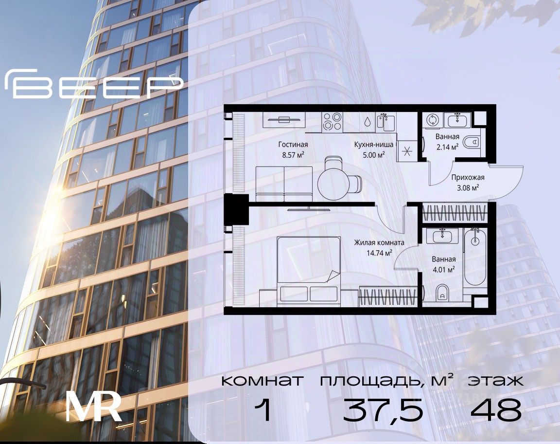 Продаётся 1-комнатная квартира общей площадью 37.54 м² без отделки в ЖК Веер на 48-м этаже 70 этажного дома.