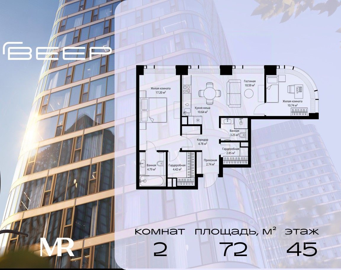 Продаётся 2-комнатная квартира общей площадью 72 м² без отделки в ЖК Веер на 45-м этаже 70 этажного дома.