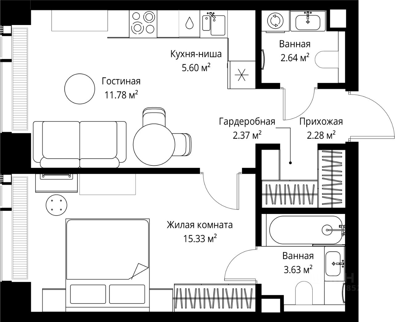 Продаётся 1-комнатная квартира общей площадью 43.63 м² без отделки в ЖК Веер на 60-м этаже 70 этажного дома.