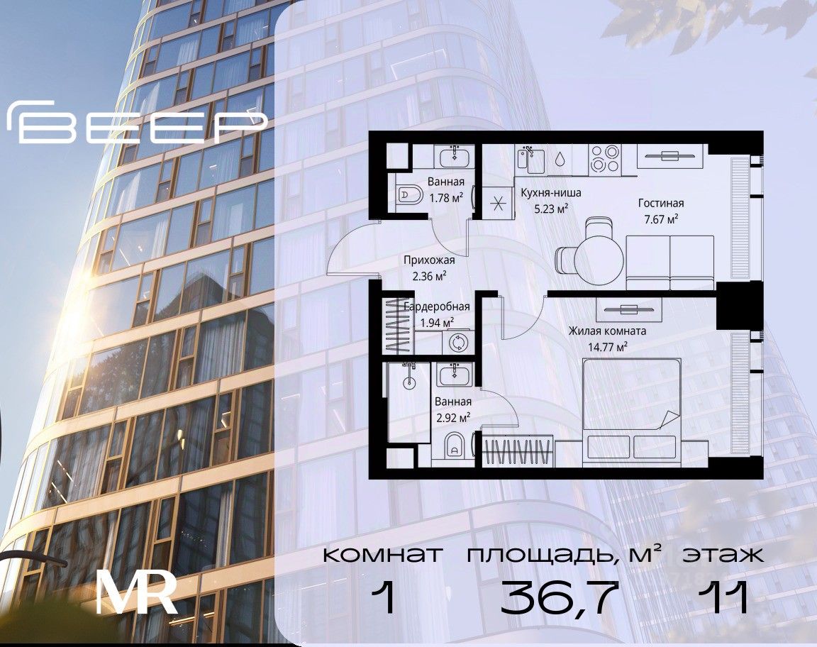 Продаётся 1-комнатная квартира общей площадью 36.67 м² без отделки в ЖК Веер на 11-м этаже 70 этажного дома.