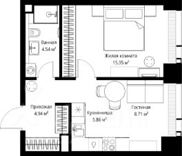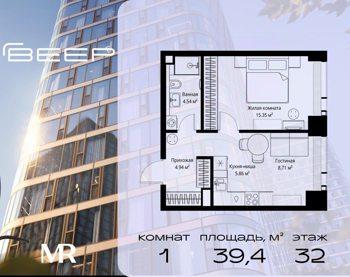 Продаётся 1-комнатная квартира общей площадью 39.40 м² без отделки в ЖК Веер на 32-м этаже 70 этажного дома.