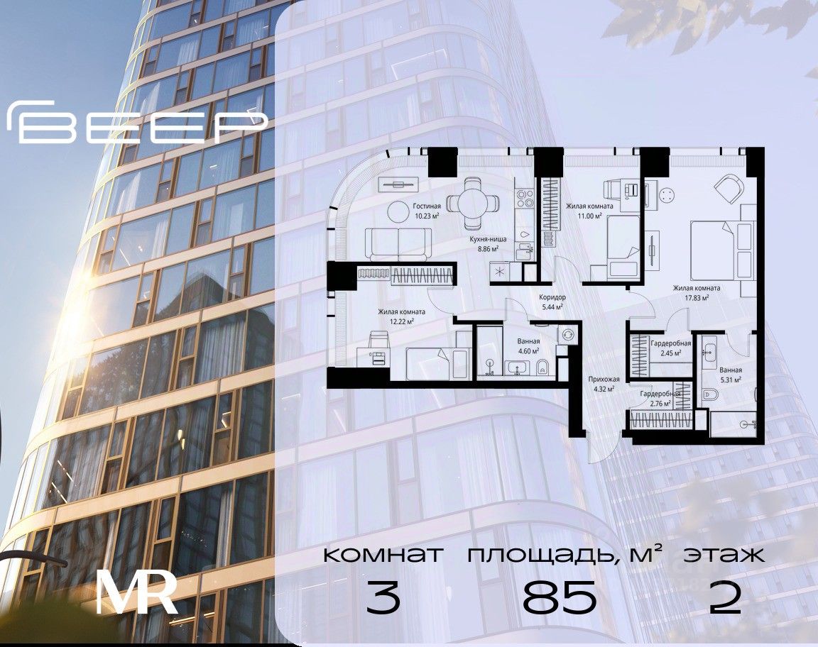 Продаётся 3-комнатная квартира общей площадью 85.02 м² без отделки в ЖК Веер на 2-м этаже 70 этажного дома.