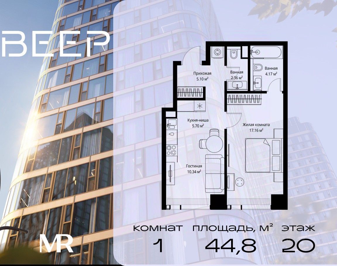 Продаётся 1-комнатная квартира общей площадью 44.83 м² без отделки в ЖК Веер на 20-м этаже 70 этажного дома.