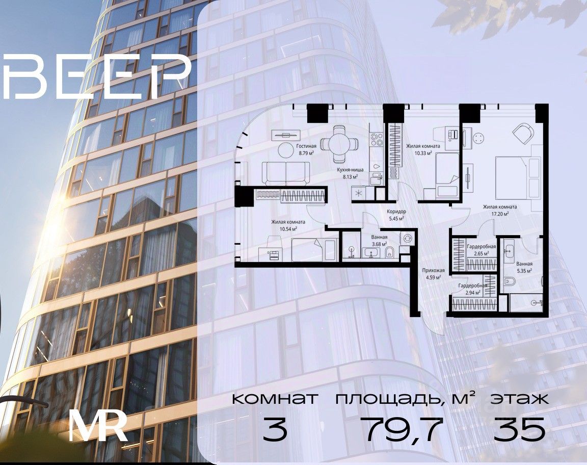 Продаётся 3-комнатная квартира общей площадью 79.65 м² без отделки в ЖК Веер на 35-м этаже 70 этажного дома.