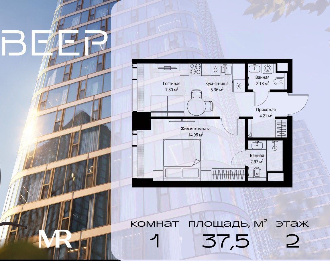 Продаётся 1-комнатная квартира общей площадью 37.45 м² без отделки в ЖК Веер на 2-м этаже 70 этажного дома.