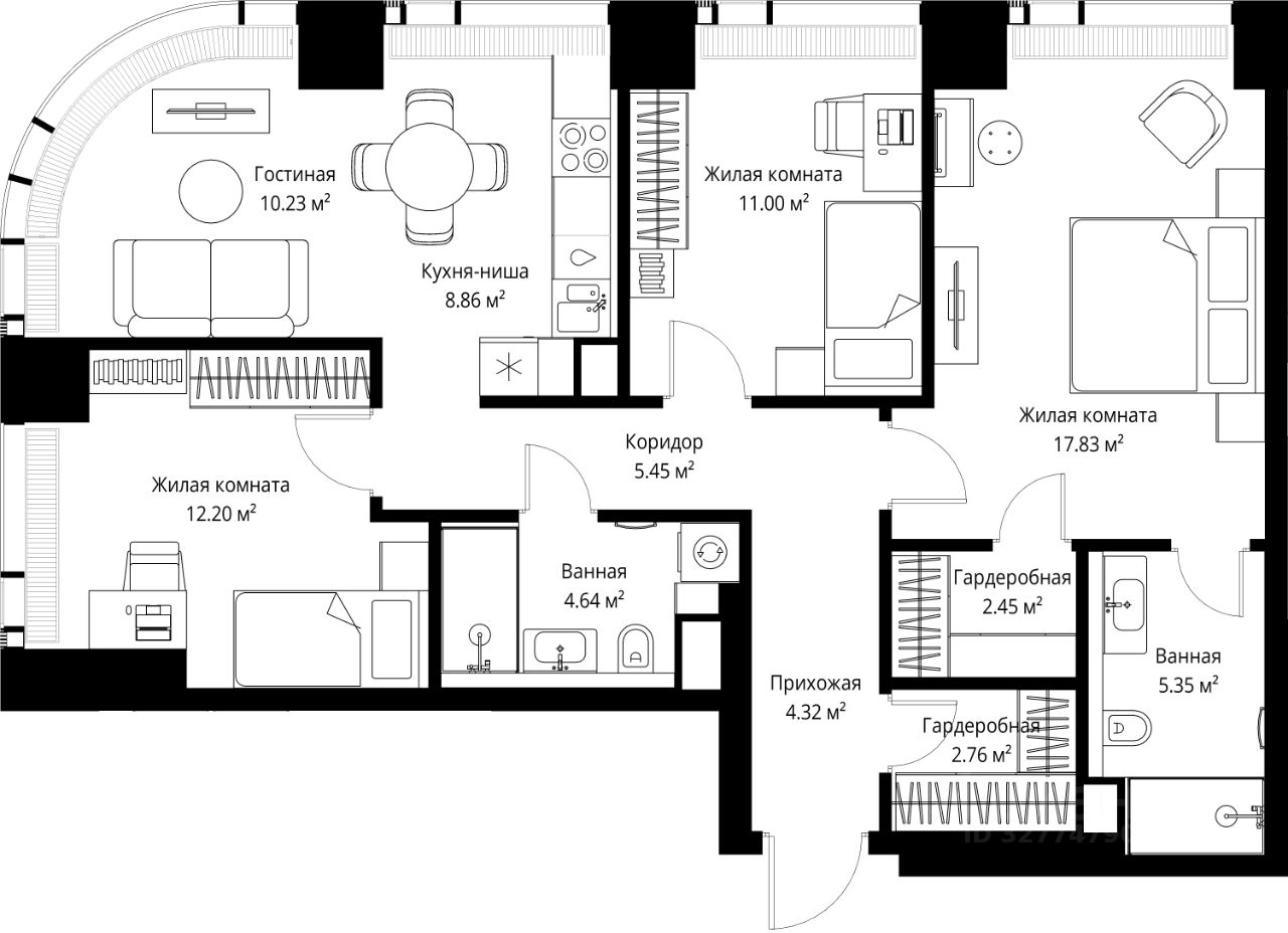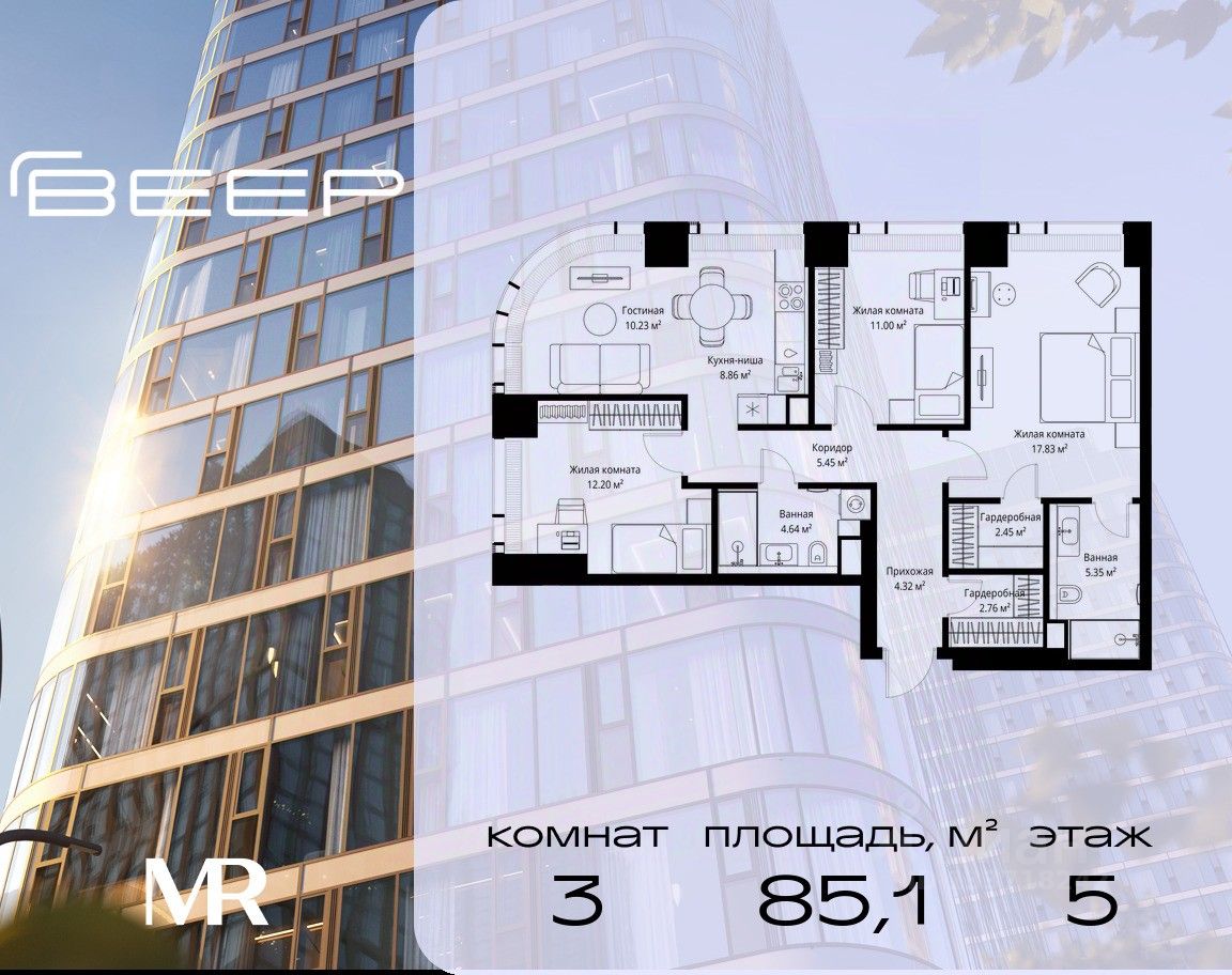 Продаётся 3-комнатная квартира общей площадью 85.09 м² без отделки в ЖК Веер на 5-м этаже 70 этажного дома.