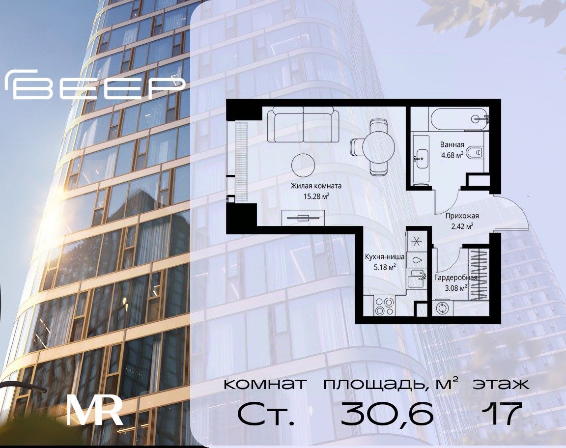 Продаётся студия общей площадью 30.64 м² без отделки в ЖК Веер на 17-м этаже 70 этажного дома.