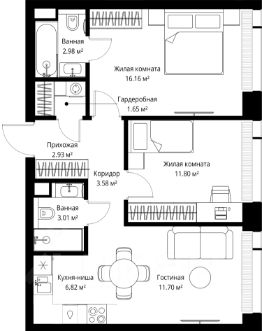 Продаётся 2-комнатная квартира общей площадью 60.63 м² без отделки в ЖК Веер на 11-м этаже 70 этажного дома.