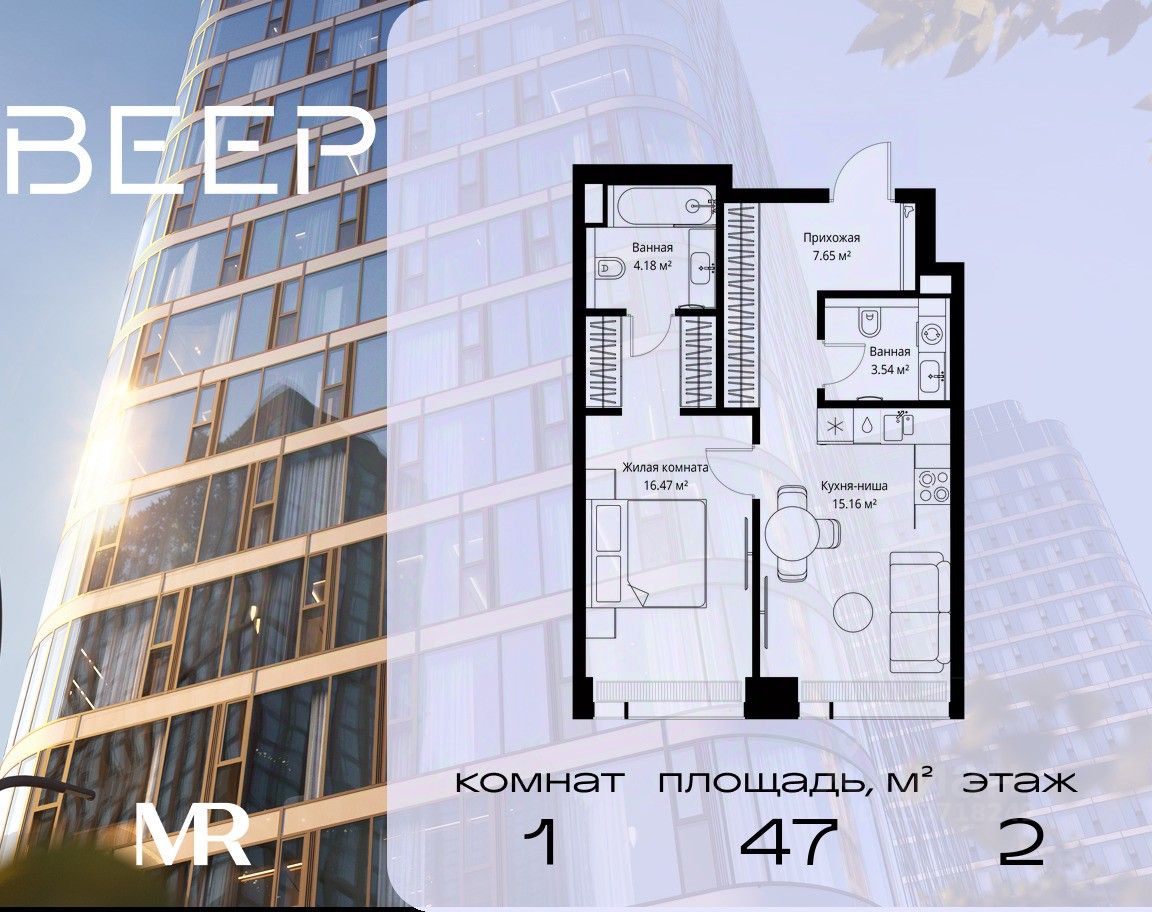 Продаётся 1-комнатная квартира общей площадью 47 м² без отделки в ЖК Веер на 2-м этаже 70 этажного дома.