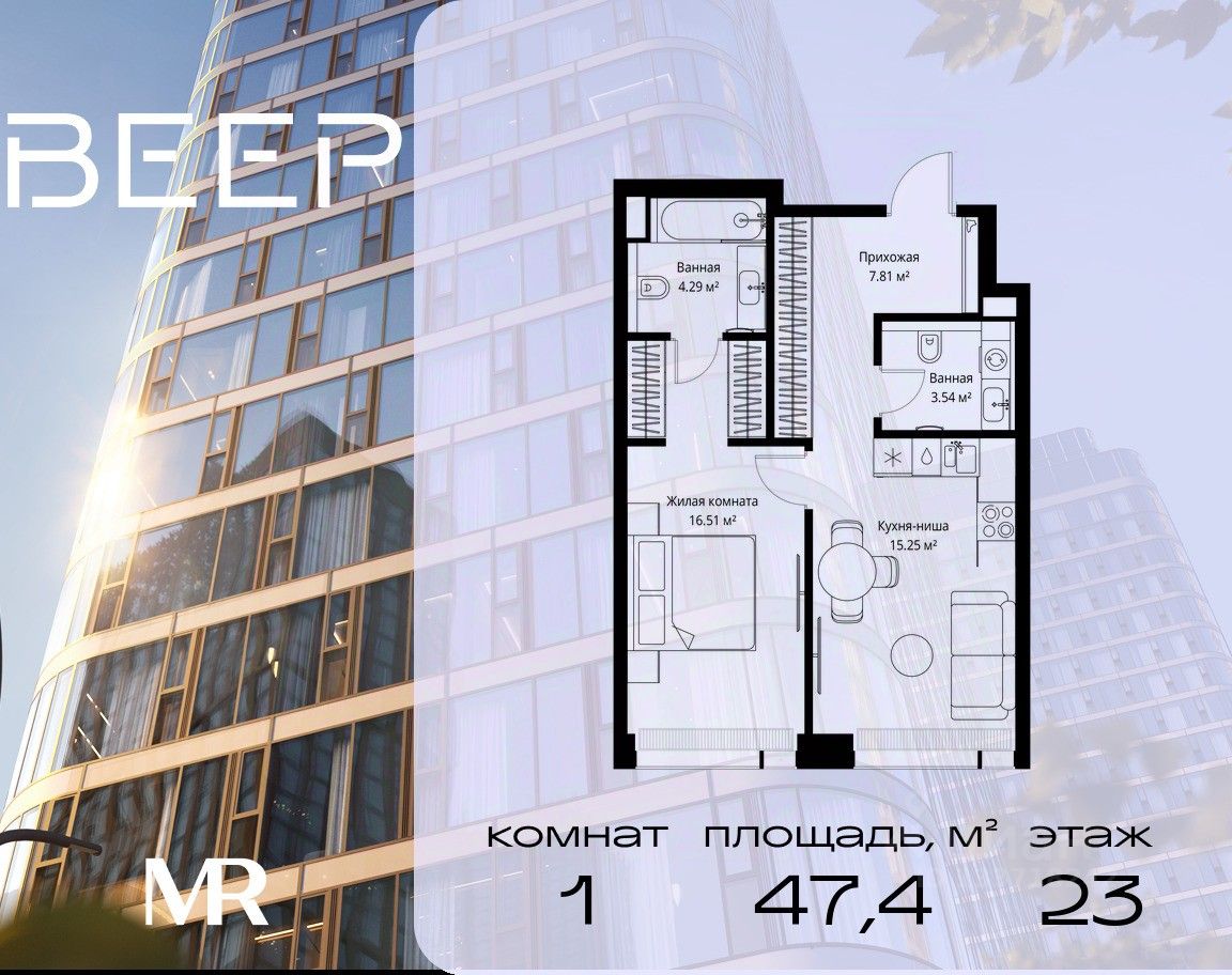 Продаётся 1-комнатная квартира общей площадью 47.40 м² без отделки в ЖК Веер на 23-м этаже 70 этажного дома.