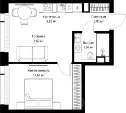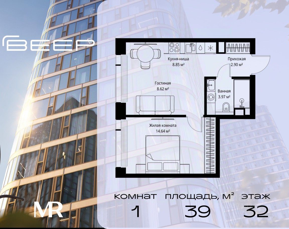 Продаётся 1-комнатная квартира общей площадью 38.98 м² без отделки в ЖК Веер на 32-м этаже 70 этажного дома.