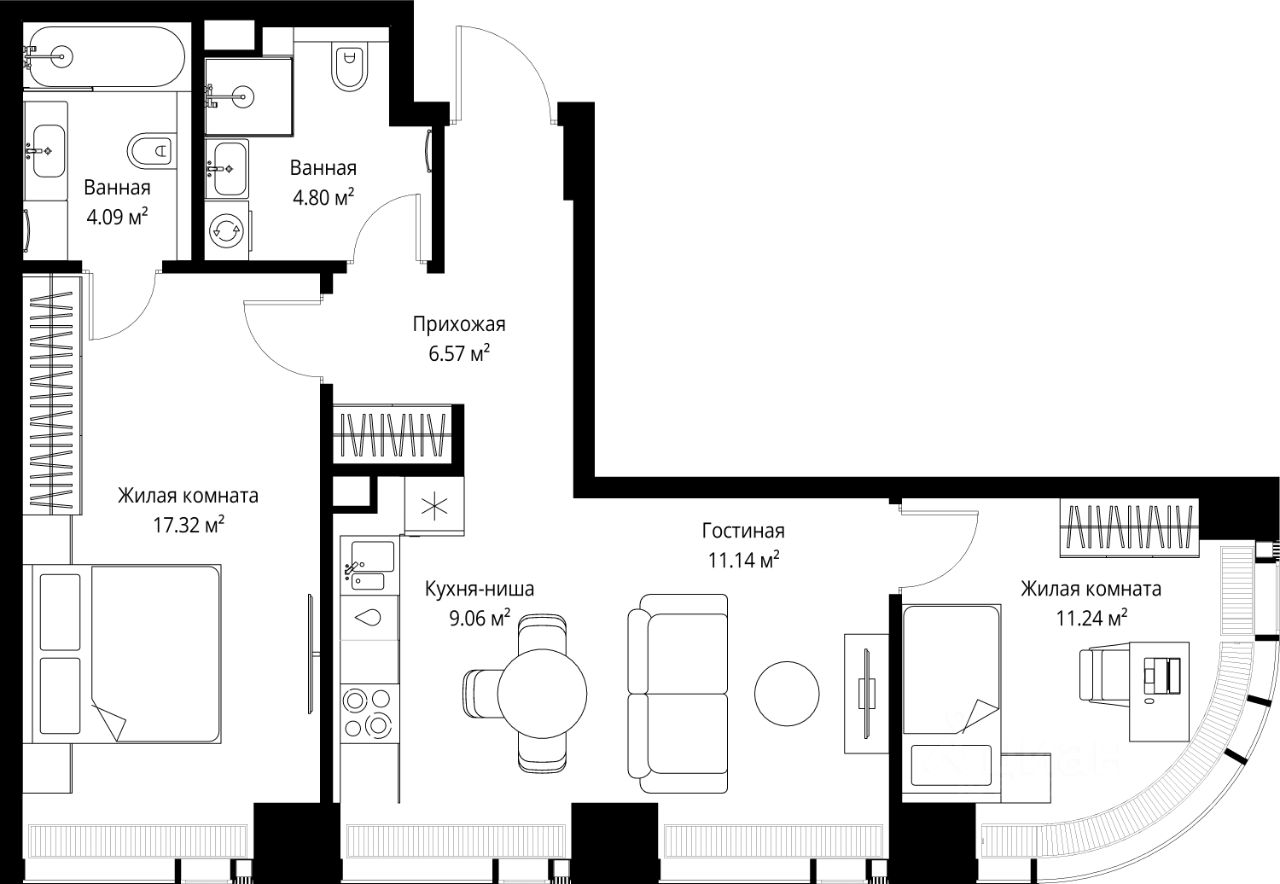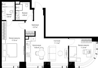Продаётся 2-комнатная квартира общей площадью 64.22 м² без отделки в ЖК Веер на 23-м этаже 70 этажного дома.