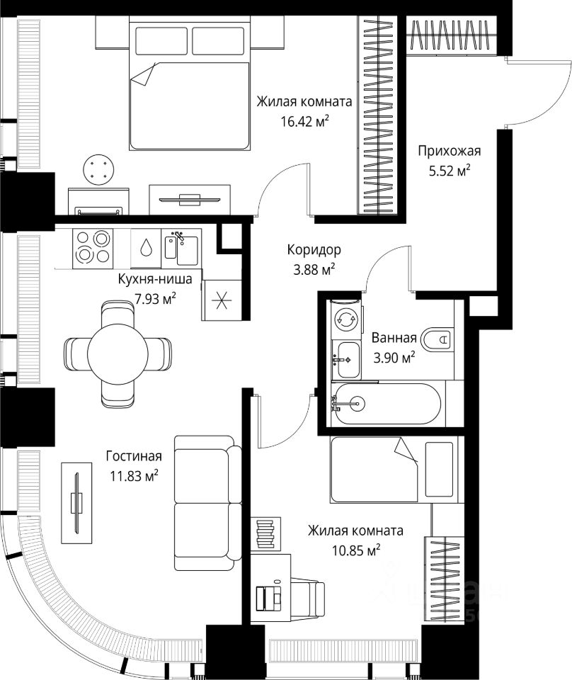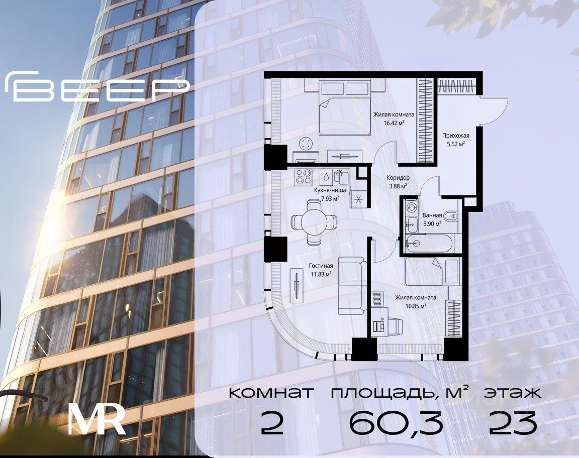Продаётся 2-комнатная квартира общей площадью 60.33 м² без отделки в ЖК Веер на 23-м этаже 70 этажного дома.