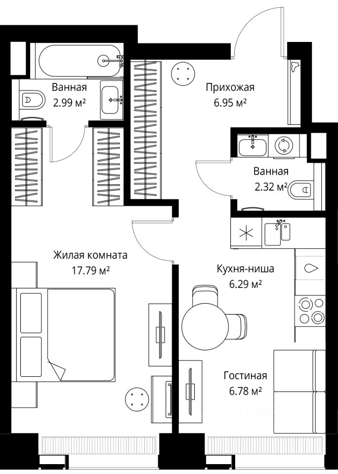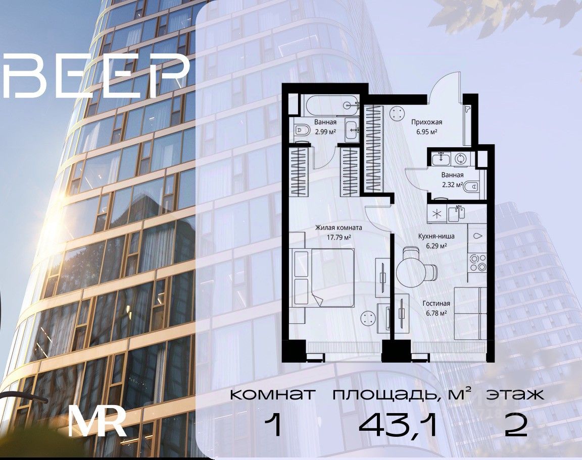 Продаётся 1-комнатная квартира общей площадью 43.12 м² без отделки в ЖК Веер на 2-м этаже 70 этажного дома.
