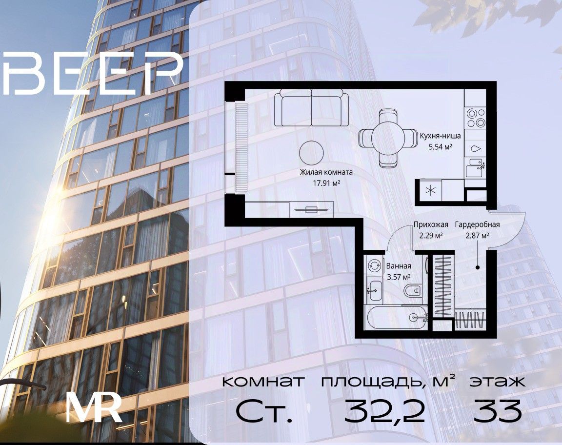 Продаётся студия общей площадью 32.18 м² без отделки в ЖК Веер на 33-м этаже 70 этажного дома.