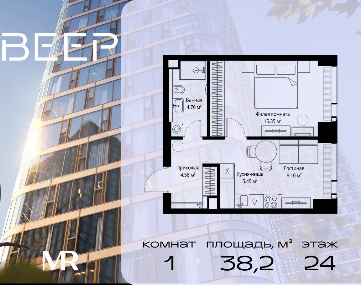 Продаётся 1-комнатная квартира общей площадью 38.22 м² без отделки в ЖК Веер на 24-м этаже 70 этажного дома.