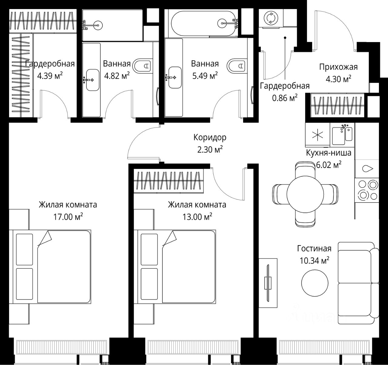 Продаётся 2-комнатная квартира общей площадью 68.52 м² без отделки в ЖК Веер на 63-м этаже 70 этажного дома.