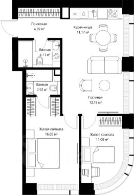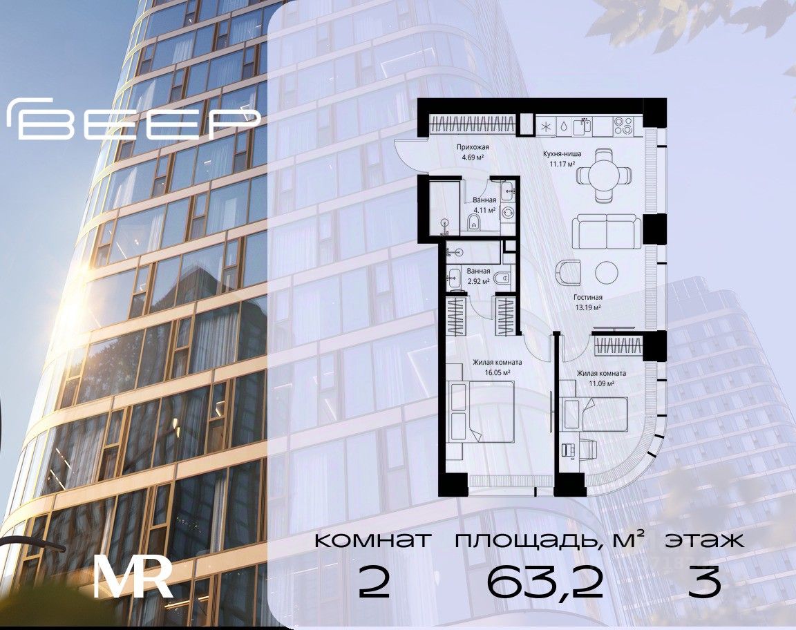 Продаётся 2-комнатная квартира общей площадью 63.22 м² без отделки в ЖК Веер на 3-м этаже 70 этажного дома.