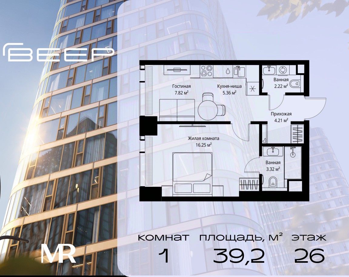 Продаётся 1-комнатная квартира общей площадью 39.18 м² без отделки в ЖК Веер на 26-м этаже 70 этажного дома.