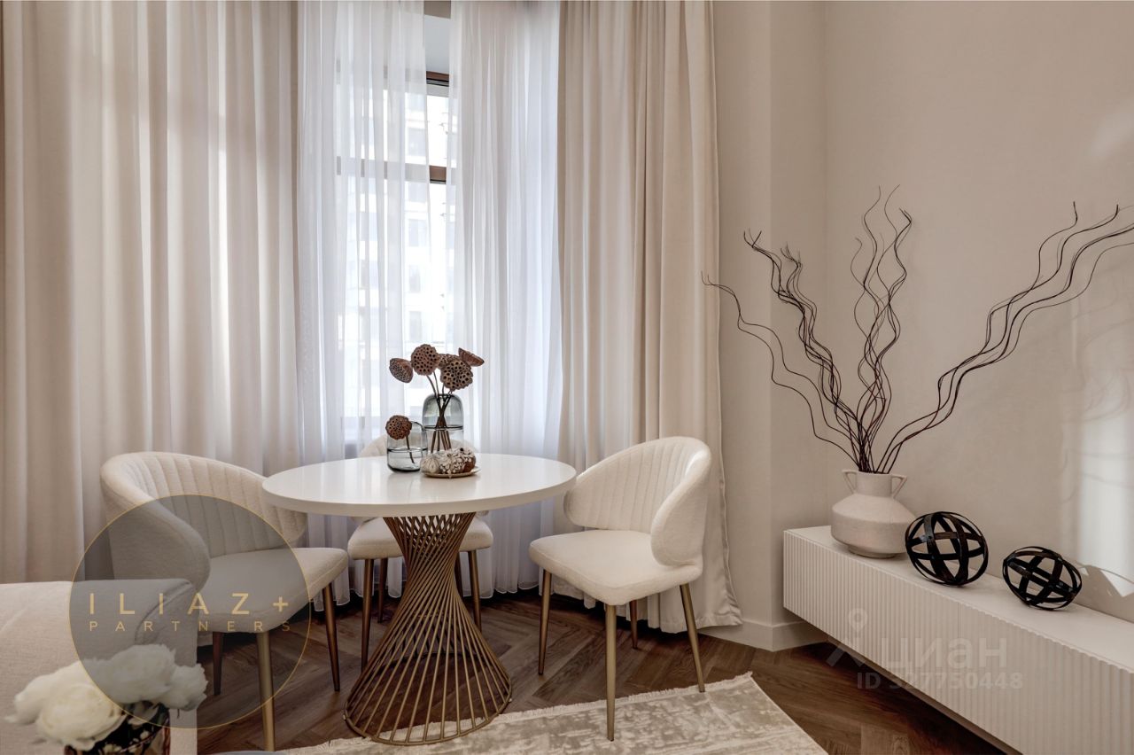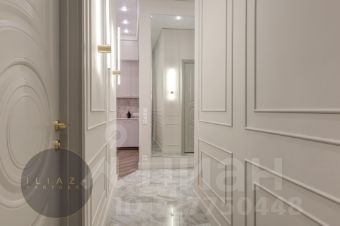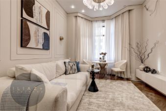 Просторная и залитая светом квартира расположена в новом жилом комплексе, выдержанном в архитектурном стиле сталинского неоклассицизма.