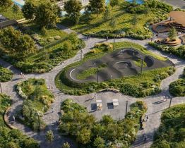 А специально для подростков мы спроектировали уникальное пространство для отдыха — памп-трек для катания, большой навес, амфитеатр и сетки для отдыха, где они смогут собираться вместе в любую погоду.