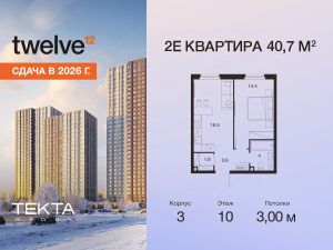 2-комн. квартира в ЖК "Твелв" на 10 этаже в 28 этажном здании Корпус 3. Общая площадь: 40.7 кв.м., жилая: 25.00 кв.м. Высота потолков 3.00 м.