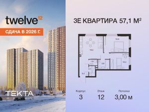 3-комн. квартира в ЖК "Твелв" на 12 этаже в 28 этажном здании Корпус 3. Общая площадь: 57.1 кв.м., жилая: 36.90 кв.м. Высота потолков 3.00 м.