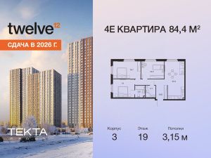 4-комн. квартира в ЖК "Твелв" на 19 этаже в 28 этажном здании Корпус 3. Общая площадь: 84.4 кв.м., жилая: 58.00 кв.м. Высота потолков 3.15 м.