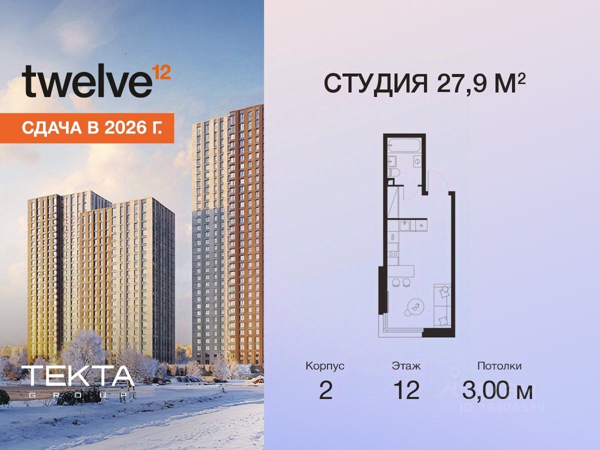 1-комн. квартира-студия в ЖК "Твелв" на 12 этаже в 22 этажном здании Корпус 2. Общая площадь: 27.9 кв.м., жилая: 11.40 кв.м. Высота потолков 3.00 м.