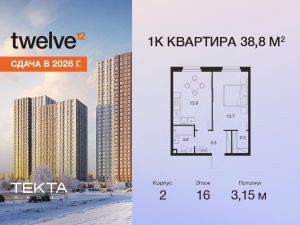 1-комн. квартира в ЖК "Твелв" на 16 этаже в 22 этажном здании Корпус 2. Общая площадь: 38.8 кв.м., жилая: 13.70 кв.м. Высота потолков 3.15 м.