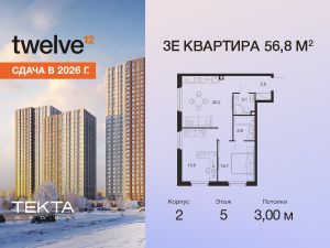 3-комн. квартира в ЖК "Твелв" на 5 этаже в 22 этажном здании Корпус 2. Общая площадь: 56.8 кв.м., жилая: 37.60 кв.м. Высота потолков 3.00 м.