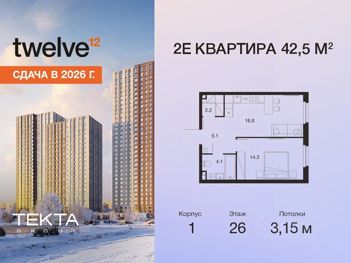 2-комн. квартира в ЖК "Твелв" на 26 этаже в 34 этажном здании Корпус 1. Общая площадь: 42.5 кв.м., жилая: 25.50 кв.м. Высота потолков 3.15 м.