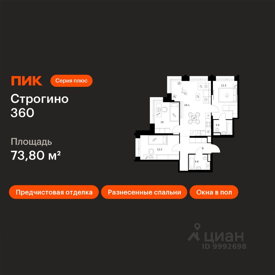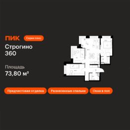 Продаётся 3-комн. квартира площадью 73,8 кв.м на 24 этаже 30 этажного дома (Корпус 1.2, Секция 1) проекта ПИК Строгино 360. Светлый просторный подъезд на уровне земли, функциональная планировка, большие окна, предчистовая отделка.