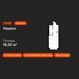 Продаётся квартира-студия площадью 18,5 кв.м на 4 этаже 38 этажного дома (Корпус 1.3, Секция 3) проекта ПИК Нарвин. Светлый просторный подъезд на уровне земли, функциональная планировка, большие окна, c отделкой.
