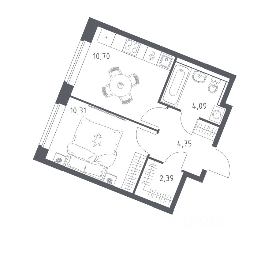 Функциональная планировка с отдельной гардеробной и полноценной кухней. Пространство удобно организовано для комфортного проживания одного человека или пары.