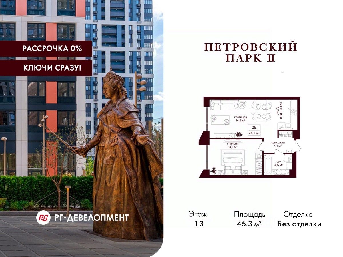 Продаётся 1-комнатная квартира 46.3 кв.м. в ЖК "Петровский парк II" на 13-м этаже 15 этажного дома.