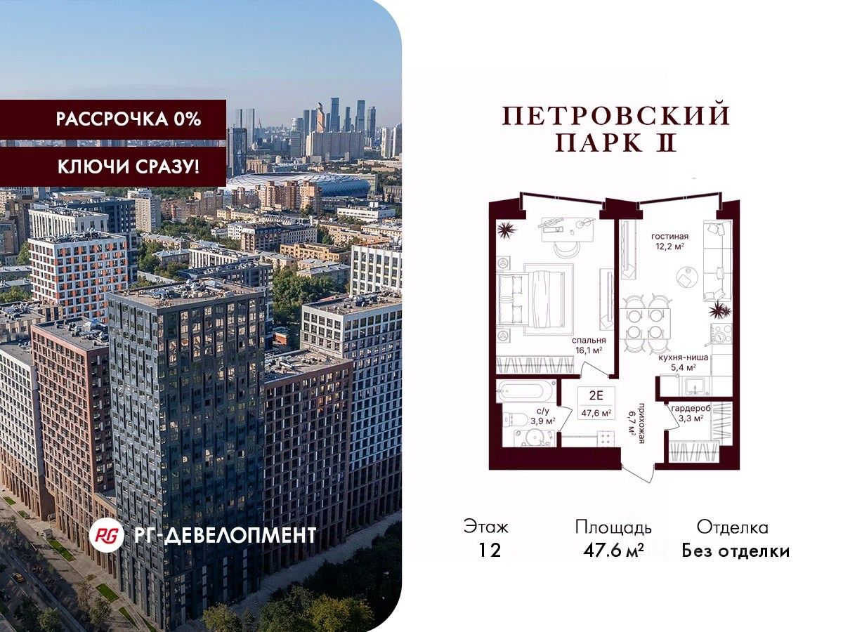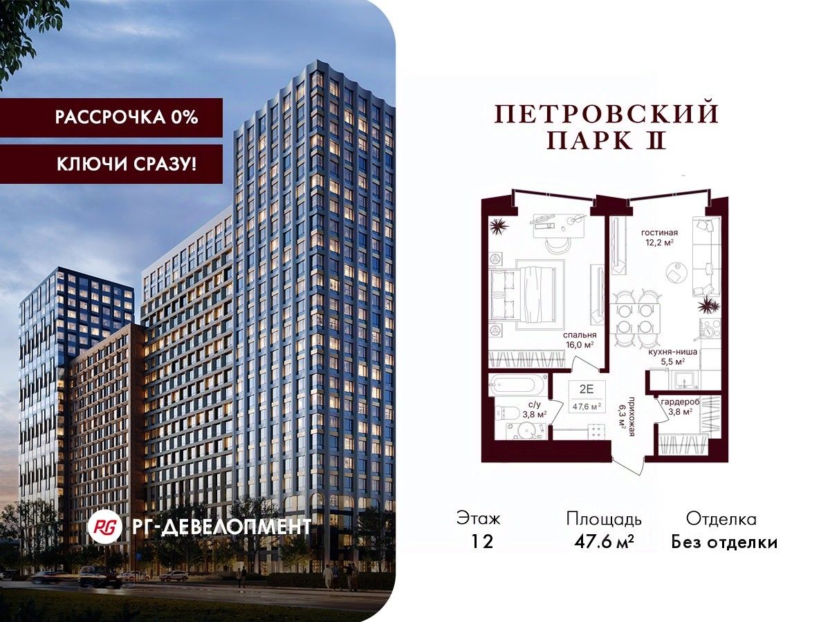 Продаётся 1-комнатная квартира 47.6 кв.м. в ЖК "Петровский парк II" на 12-м этаже 25 этажного дома.