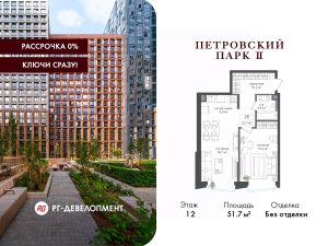 Продаётся 1-комнатная квартира 51.7 кв.м. в ЖК "Петровский парк II" на 12-м этаже 25 этажного дома.