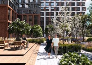 Внутренний двор комплекса - это отдельный мир, закрытый от машин и городского шума. Продуманное благоустройство территорий отсылает к регулярным дворцовым садам: геометрия аллей, зелёные "кабинеты", цветники и камерные зоны отдыха создают разные сценарии для повседневной жизни. Здесь органично соседствуют детские игровые пространства, спортивные зоны и тихие места для отдыха.