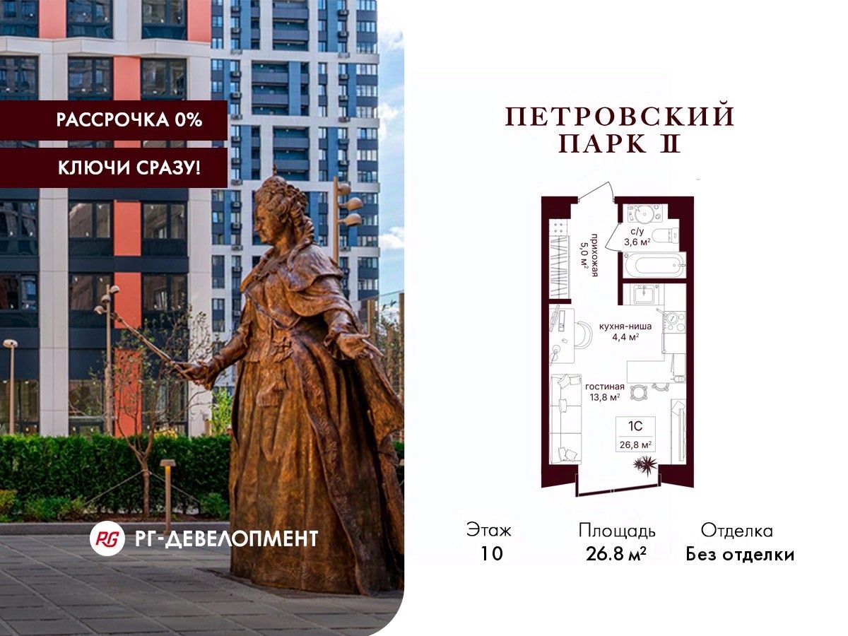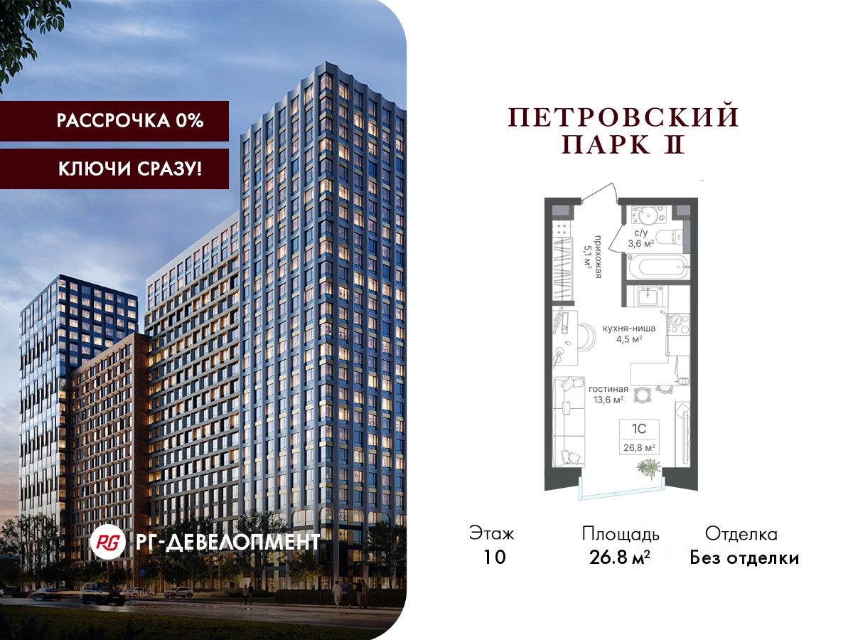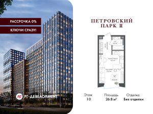 Продаётся Студия 26.8 кв.м. в ЖК "Петровский парк II" на 10-м этаже 25 этажного дома.