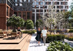 Внутренний двор комплекса - это отдельный мир, закрытый от машин и городского шума. Продуманное благоустройство территорий отсылает к регулярным дворцовым садам: геометрия аллей, зелёные "кабинеты", цветники и камерные зоны отдыха создают разные сценарии для повседневной жизни. Здесь органично соседствуют детские игровые пространства, спортивные зоны и тихие места для отдыха.