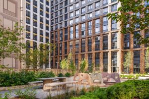 • Закрытый двор без машин, вдохновлённый эстетикой дворцовых садов;