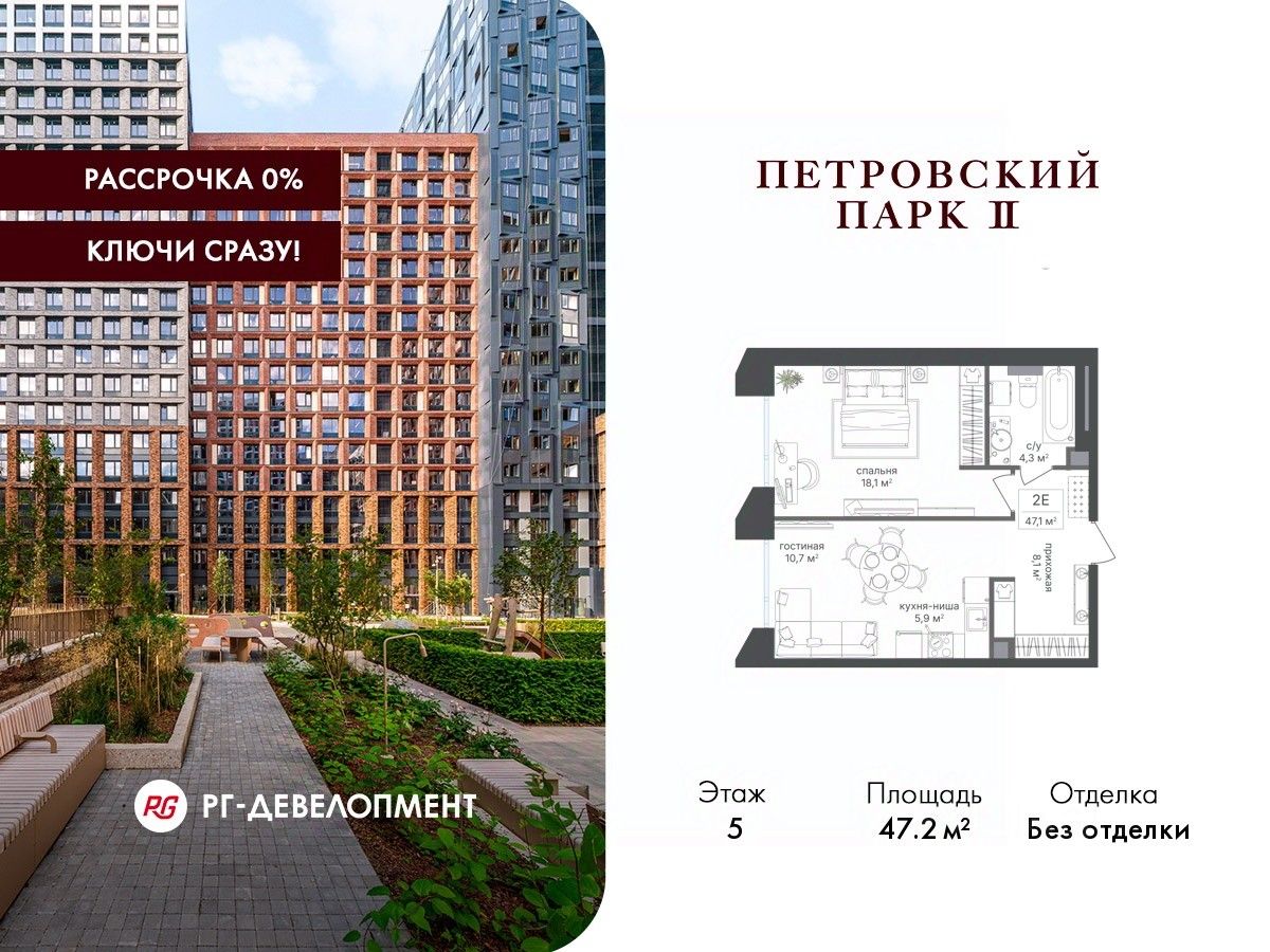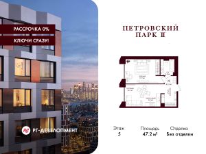 Продаётся 1-комнатная квартира 47.2 кв.м. в ЖК "Петровский парк II" на 5-м этаже 19 этажного дома.