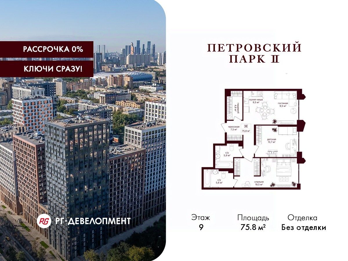 Продаётся 2-комнатная квартира 75.8 кв.м. в ЖК "Петровский парк II" на 9-м этаже 19 этажного дома.